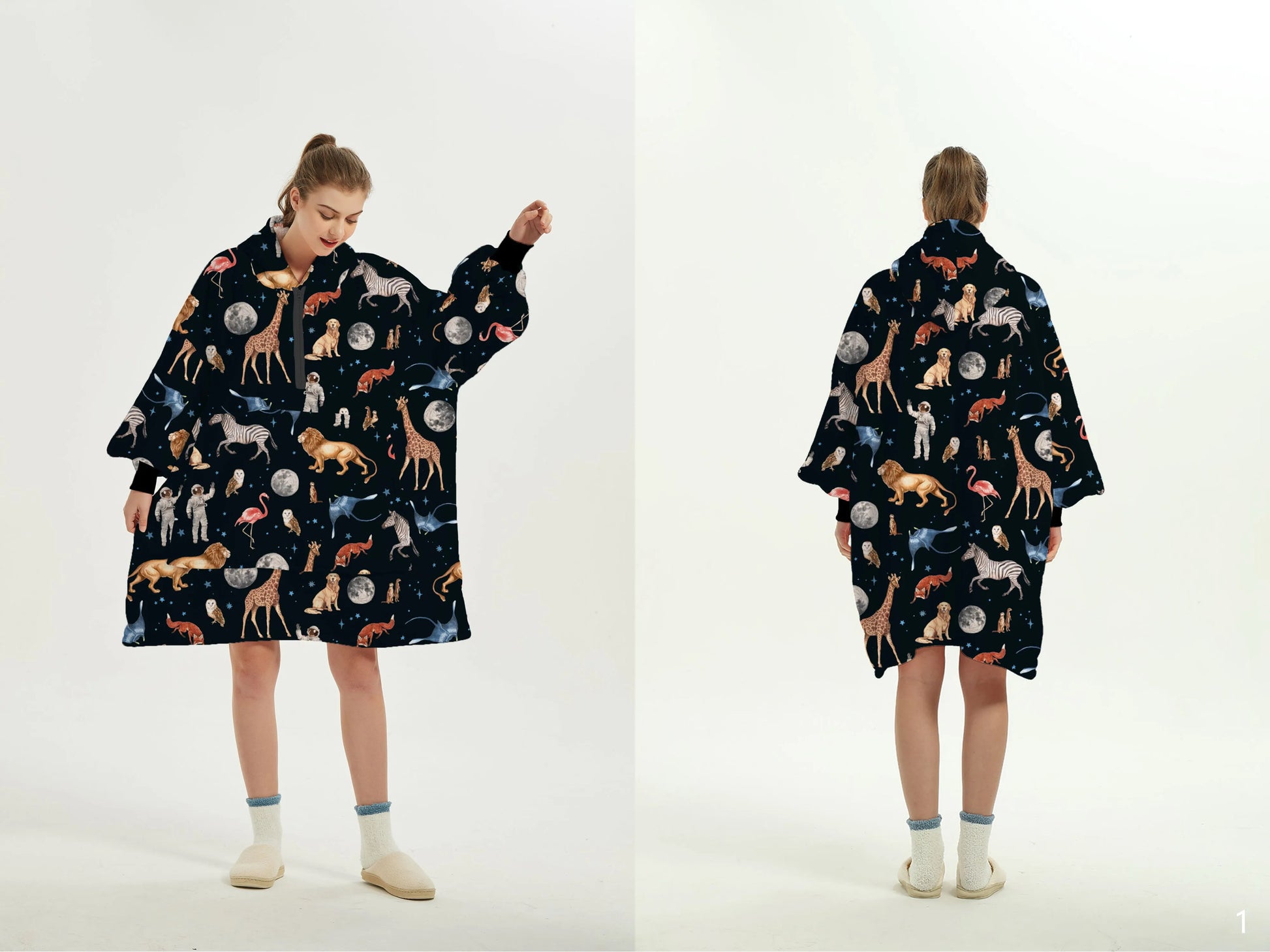 Throw one of these ultra-comfortable, soft wearable hoodie blankets on over your Moonsuit for extra warmth. Certified OEKO-TEX Polyester with sherpa fleece lining.